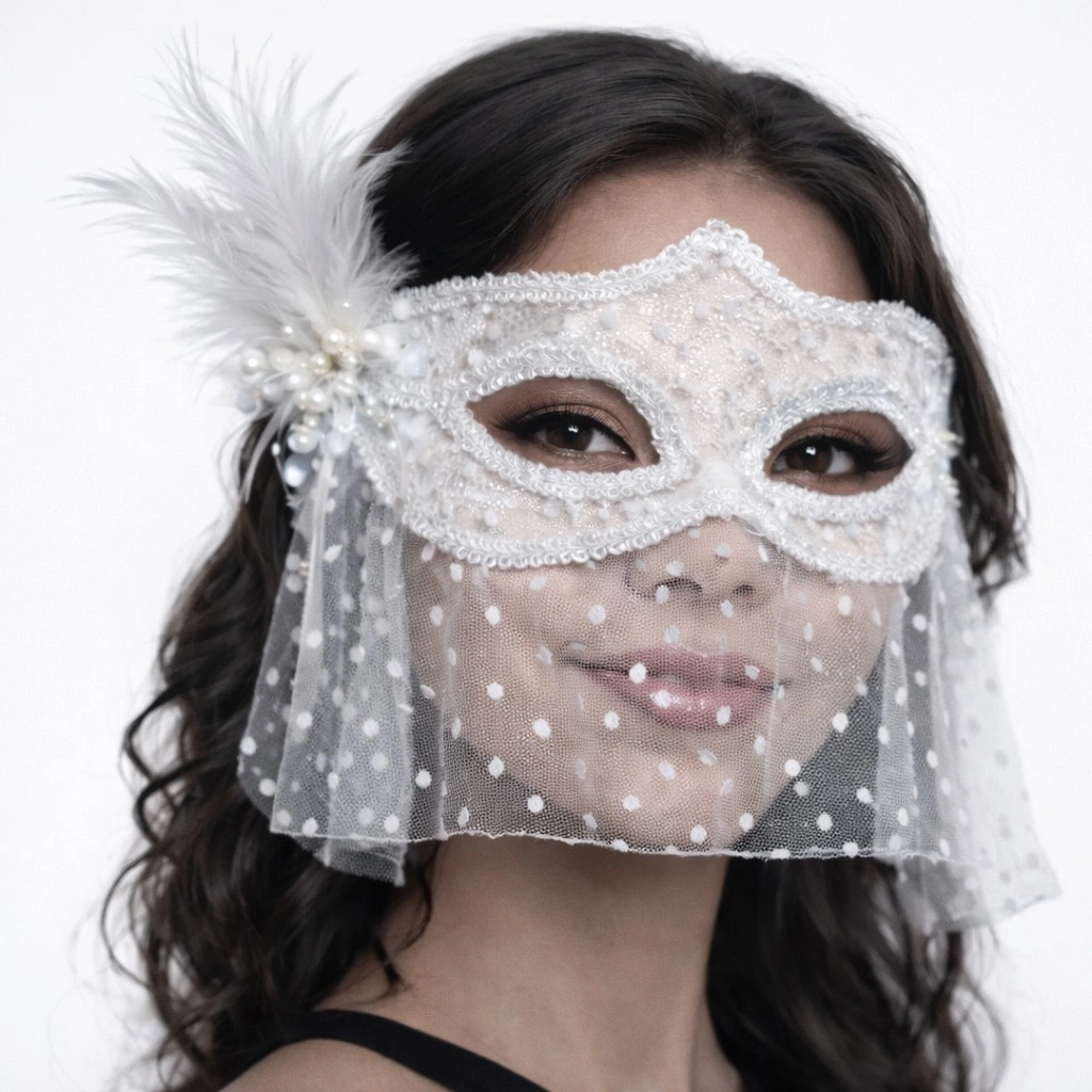 Beyaz Dantel Tüllü Peçeli Parti Maskesi – Tüylü İnci Detaylı