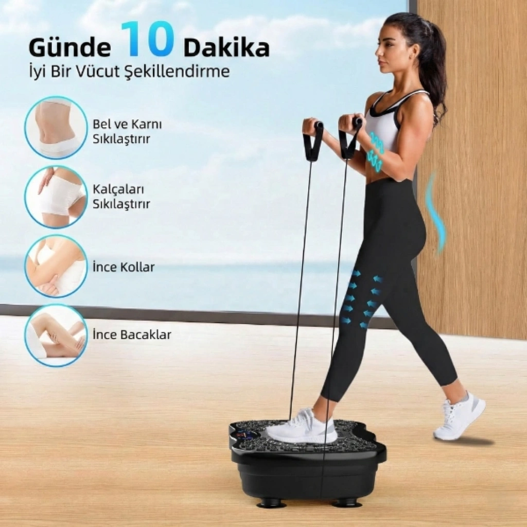 BLUETOOTH BAĞLANTILI TİTREŞİMLİ EGZERSİZ ALETİÜrün ÖzellikleriBluetooth bağlantılı titreşimli egzersiz aleti, evde kısa sürede etkili ve hedef odaklı antrenman yapmak isteyenler için geliştirilmiş ileri seviye bir titreşim platformudur. Gelişmiş çift motor teknolojisi sayesinde 120 seviyeye kadar titreşim hızı sunarak akıcı, güçlü ve dengeli bir performans sağlar; bu sayede geleneksel aerobik egzersizlere kıyasla kasları daha yoğun ve verimli şekilde çalıştırmaya yardımcı olur. Üç adet önceden ayarlanmış akıllı mod, farklı fitness hedeflerine hızlıca uyum sağlarken manuel ayarlama seçeneği ile kişisel antrenman programınızı oluşturmanıza imkân tanır. Günlük rutine kolayca eklenebilen bu cihaz, bir ay boyunca günde yalnızca 10 dakikalık kullanımda dahi gözle görülür sonuçlar elde etmeyi hedefler. Bluetooth bağlantı özelliği sayesinde müzik eşliğinde motive edici antrenman deneyimi sunar. Direnç bantları ile birlikte kullanıldığında üst vücut egzersizlerini de destekler. Farklı hız ve titreşim seviyeleri ile hem yeni başlayanlar hem de ileri seviye kullanıcılar için uygundur. Günlük spor rutini oluşturmak, kilo kontrolüne destek olmak ve vücudu şekillendirmek isteyenler için pratik ve etkili bir çözümdür. Kaymaz yüzeyi ve sağlam gövde yapısı güvenli kullanım sunarken, kompakt tasarımı ev ortamında pratik depolama avantajı sağlar. Kilo kontrolüne destek olmak, vücudu şekillendirmek ve düzenli spor alışkanlığı kazanmak isteyenler için güçlü ve modern bir egzersiz çözümüdür.Paket İçeriği1 adet Bluetooth Bağlantılı Titreşimli Egzersiz Aleti