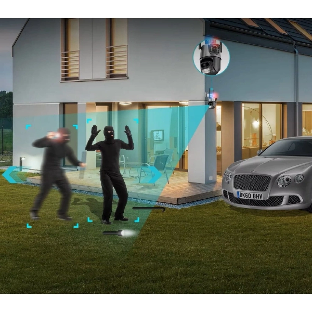 ÇAKARLI ÇİFT LENSLİ DIŞ MEKAN GÜVENLİK KAMERASIÜrün ÖzellikleriÇakarlı çift lensli dış mekan güvenlik kamerası, yüksek çözünürlüklü 8MP görüntü kalitesiyle profesyonel güvenlik çözümleri sunar. Çift lens tasarımı sayesinde geniş açılı ve detaylı görüntü sağlar. Gece görüş özelliği ile düşük ışıkta bile net kayıt yapabilir ve tam renkli gece görüntüleme desteğiyle güvenliği en üst seviyeye taşır. Çakarlı alarm özelliği sayesinde şüpheli durumlarda görsel ve işitsel uyarı verir. Çift yönlü ses desteği sayesinde kamera üzerinden karşılıklı iletişim kurulabilir. IP66 su geçirmezlik standardına sahip olan kamera, yağmur, kar ve toz gibi zorlu hava koşullarında sorunsuz çalışır. Hareket algılama özelliği ile anında mobil cihazlara bildirim gönderir ve Bluetooth desteğiyle hızlı bağlantı imkânı sunar. PTZ kontrol desteği sayesinde 355° yatay ve 90° dikey açıyla çevreyi eksiksiz izleyebilirsiniz.Paket İçeriği1 adet Çakarlı Çift Lensli Dış Mekan Güvenlik Kamerası