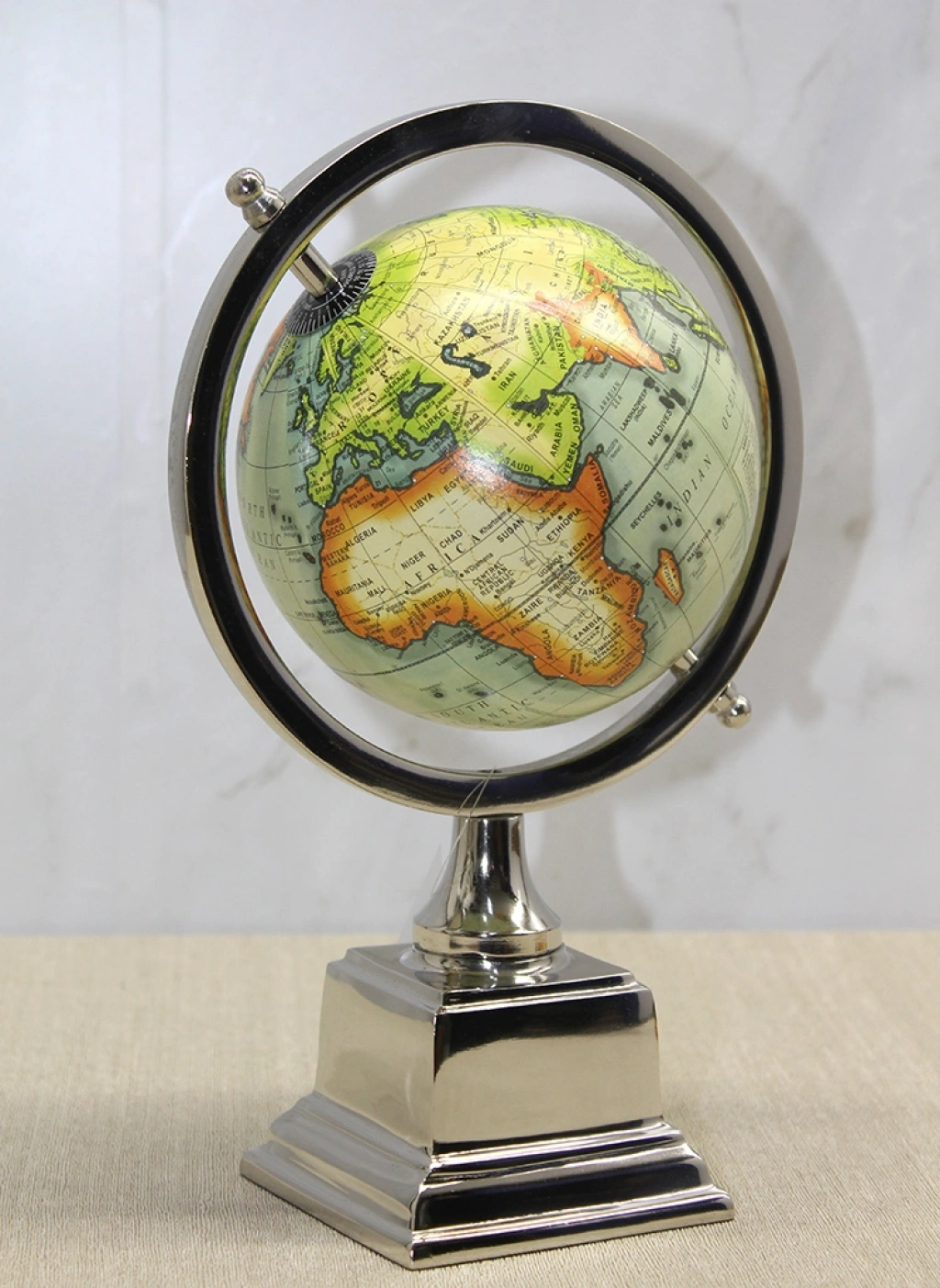 DEKORATİF MASAÜSTÜ DÜNYA KÜRE - MODEL 19Ürün ÖzellikleriDekoratif Masaüstü Dünya Küre - Model 19, açık zeminli klasik atlas tasarımı ve parlak metal detaylı stand yapısıyla modern ve zarif bir dekoratif görünüm sunar. 26x19 cm ölçüsü sayesinde masa üzerinde dengeli bir yükseklik oluşturur ve bulunduğu alanda şık bir odak noktası haline gelir. Açık tonlu okyanus zemini üzerinde yer alan canlı kıta renkleri, harita detaylarını daha belirgin ve estetik bir şekilde yansıtır. Metal meridyen halkası ve parlak blok kaide tasarımı ürüne çağdaş bir karakter kazandırır. Metal ayaklı masaüstü dünya küre arayan kullanıcılar için hem klasik hem modern dekorasyonla uyum sağlayan estetik bir alternatiftir. Çalışma masası, ofis sehpası, kitaplık ya da salon konsolu üzerinde rahatlıkla konumlandırılabilir. dekoratif atlas dünya küresi, bulunduğu ortama entelektüel bir hava katarken düzenli ve prestijli bir görünüm oluşturur. Sağlam stand yapısı sayesinde stabil durur ve uzun süreli dekoratif kullanım için uygundur.Ürün Teknik ÖzellikleriÖzellikAçıklamaÜrün AdıDekoratif Masaüstü Dünya Küre - Model 19Boyut26 x 19 cmKullanım TürüMasaüstüTasarımAçık Zeminli Klasik AtlasKullanım AlanıEv, Ofis, Çalışma AlanıPaket İçeriği1 Adet Dekoratif Masaüstü Dünya Küre - Model 19