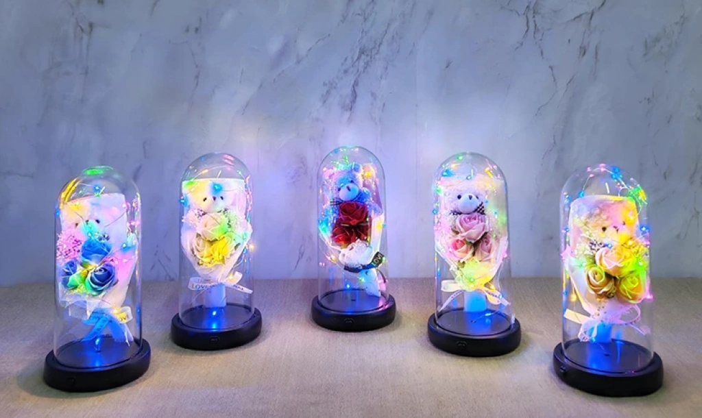 Işıklı Müzikli Fanus içinde Sevimli Ayıcıklı Gül Buketi