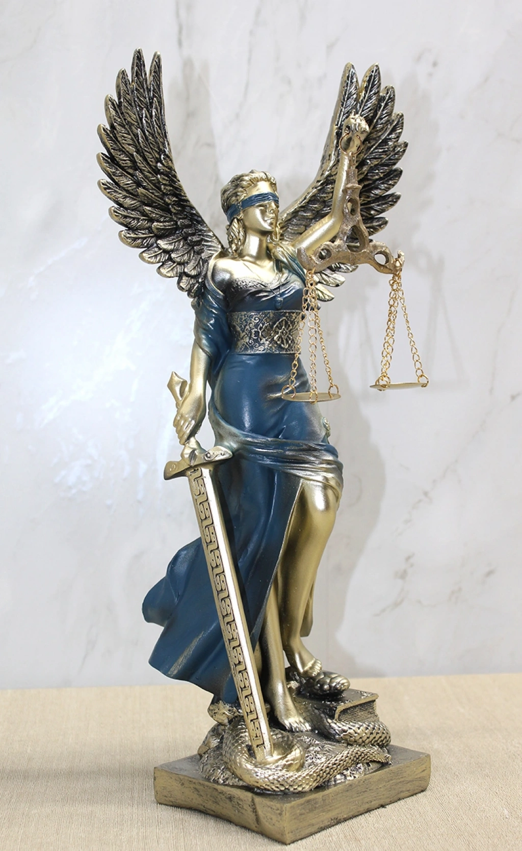 KANATLI ADALET BİBLOSU BÜYÜK BOYÜrün ÖzellikleriKanatlı Adalet Biblosu Büyük Boy, adaletin simgesi olan figürü güçlü ve estetik bir duruşla yansıtan dekoratif bir heykel modelidir. 40x11 cm boyutundaki büyük ve dikkat çekici yapısı sayesinde ofislerde, çalışma masalarında, hukuk bürolarında, kütüphanelerde ve ev dekorasyonlarında etkileyici bir tamamlayıcı olarak yer alır. Dengeli terazi detayı, zırh ve kanat işçiliği ile birleşerek figüre hem zarafet hem de güç hissi kazandırır. Polyester malzemeden üretilmiş olması ürüne uzun ömür, sağlamlık ve detaylarda yüksek işçilik sağlar. Hem dekor amaçlı hem de avukatlar, hukuk öğrencileri veya adalet temalı objeleri sevenler için anlamlı bir hediye seçeneğidir.Paket İçeriği1 adet Kanatlı Adalet Biblosu Büyük Boy