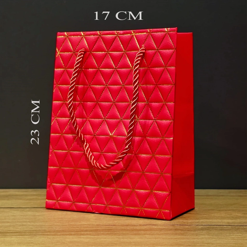 KIRMIZI GEOMETRİK DESENLİ ORTA BOY KARTON HEDİYE ÇANTASI Ürün ÖzellikleriHediyenize kırmızı rengin enerjisini ve zarafetini katın! Kırmızı Geometrik Desenli Orta Boy Karton Hediye Çantası, modern üç boyutlu dokusu ve göz alıcı rengiyle tüm özel anlarınıza değer katar. 23x17 cm boyutlarındaki ideal yapısı; parfümler, orta boy aksesuarlar, kişisel bakım setleri veya dekoratif objeler için mükemmel bir paketleme çözümüdür. Yüksek kaliteli ve dayanıklı karton malzemeden üretilen gövdesi, üzerindeki geometrik kabartmalar sayesinde ışığı estetik bir şekilde yansıtarak prestijli bir görünüm sunar. Canlı kırmızı tonu; Sevgililer Günü, yılbaşı, yıl dönümleri veya özel kutlamalar için vazgeçilmez bir tercih oluşturur. Sağlam ve uyumlu kırmızı ip sapları sayesinde hediyenizi büyük bir güven ve şıklıkla sevdiklerinize ulaştırır.Ürün Teknik ÖzellikleriÖzellikAçıklamaBoyutlar23 cm (Yükseklik) x 17 cm (Genişlik)MalzemeBirinci Sınıf Kaliteli ve Kalın KartonTasarımLüks Kırmızı Geometrik Kabartma DesenliBoyut TipiOrta Boy (Medium)Taşıma SapıUyumlu Kırmızı Tonlarında Dayanıklı İp SapKullanım AlanıSevgililer Günü, Yılbaşı, Yıl Dönümü ve Özel HediyeliklerPaket İçeriği1 Adet Kırmızı Geometrik Desenli Orta Boy Karton Hediye Çantası (23x17 cm).
