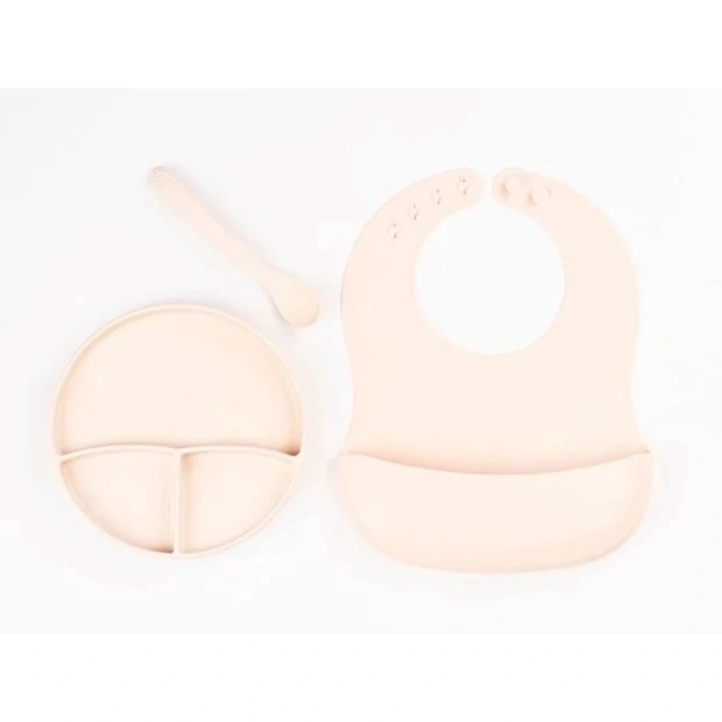 KREM RENGİ 3’LÜ SİLİKON YEMEK SETİ – ÖNLÜK + DİŞ KAŞIYICILI KAŞIK + VAKUMLU TABAKÜrün ÖzellikleriKrem rengi 3’lü silikon yemek seti, bebeklerin beslenme saatlerini daha keyifli ve güvenli hale getirmek için tasarlanmıştır. Kaymaz tabanlı vakumlu tabak, sabit durarak yiyeceklerin dökülmesini önler ve 3 bölmeli yapısı sayesinde farklı besinlerin ayrı ayrı sunulmasına imkan tanır. Yumuşak uçlu diş kaşıyıcılı silikon kaşık, miniklerin hassas diş etlerine zarar vermez ve aynı zamanda diş çıkarma döneminde kaşıyıcı olarak kullanılabilir. Ayarlanabilir mama önlüğü, 4 farklı boy seçeneği ve çift kilit sistemi ile bebeğinizin hareketlerine uyum sağlar. Geniş haznesi dökülen yiyecekleri yakalayarak çevrenin temiz kalmasını sağlar.%100 güvenli ve sağlıklı silikon malzemeden üretilmiştir. Lateks içermez, alerji riski taşımaz, dayanıklı, elastik ve kırılmaz yapısıyla uzun süre kullanım sunar. Düşük ısı iletkenliği sayesinde güvenli bir deneyim sağlar. Hem elde hem de bulaşık makinesinde yıkanabilir ve renkleri solmadan uzun ömürlüdür.Paket İçeriği1 adet vakumlu 3 bölmeli tabak1 adet diş kaşıyıcılı silikon kaşık1 adet ayarlanabilir silikon mama önlüğü