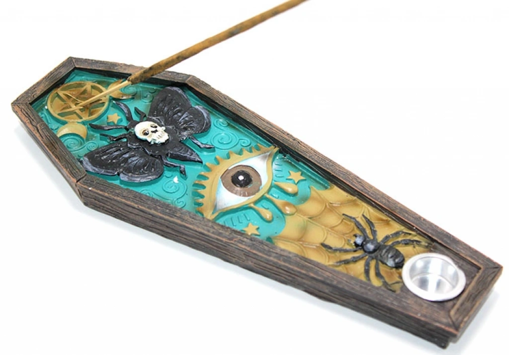 POLYESTER TÜTSÜLÜK MODEL 2Ürün ÖzellikleriPolyester tütsülük model 2, gotik ve mistik tasarımıyla dikkat çeken özel bir tütsü standıdır. Dayanıklı polyester malzemeden üretilmiş olup, uzun süreli kullanım imkanı sunar. Tabut şeklindeki çerçevesi ve üzerinde bulunan semboller, büyülü ve mistik bir hava katarken dekoratif bir obje olarak da kullanılabilir. Göz, örümcek ve kelebek gibi detaylar, ürüne sanatsal bir dokunuş ekler ve spiritüel çalışmalarınıza anlam katar. Tütsü çubuğunuzu güvenle yerleştirebileceğiniz bölmesi, tütsünün külünü etrafa dökülmeden toplamaya yardımcı olur. Meditasyon, yoga ve enerji dengeleme ritüelleri için mükemmel bir aksesuardır.Paket İçeriği1 adet Polyester Tütsülük Model 2