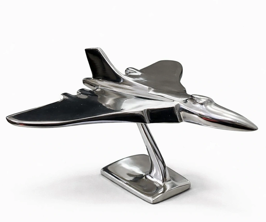 VULCAN KROM UÇAKÜrün ÖzellikleriVulcan Krom Uçak, havacılık tarihinin en etkileyici tasarımlarından biri olan stratejik bombardıman uçağı Vulcan'ın ikonik delta kanat yapısını modern bir estetikle buluşturuyor. 20x13 cm boyutlarındaki ideal formu, uçağın fütüristik ve güçlü hatlarını büyük bir hassasiyetle yansıtır. Yüksek kaliteli krom kaplama sayesinde elde edilen ayna efektli pürüzsüz yüzeyi, bulunduğu her ortamda ışığı mükemmel şekilde kırarak sofistike bir şıklık sunar. Ürünün altına entegre edilen eğimli estetik stand yapısı, uçağın dinamik bir uçuş pozisyonunda sergilenmesini sağlayarak tasarıma derinlik kazandırır. Bu dekoratif Vulcan modeli, dayanıklı metalik malzemesi ile uzun ömürlü bir kullanım vaat ederken, pürüzsüz işçiliği ile premium bir aksesuar hissi uyandırır. Hem ofis masaları için prestijli bir simge hem de havacılığa ilgi duyan sevdikleriniz için unutulmaz bir hediyelik eşya seçeneği olan bu krom uçak biblosu, zamansız tasarımıyla modern ve klasik dekorasyon stillerine kolayca uyum sağlar.Ürün Teknik ÖzellikleriÖzellikAçıklamaÜrün AdıVulcan Krom UçakBoyut20x13 cmMalzemeKrom Kaplama Yüksek Kaliteli Metalik MalzemeTasarımİkonik Delta Kanat Vulcan Formu - StandlıRenkParlak Gümüş / KromStilModern / Endüstriyel / Havacılık TemalıKullanım AlanıOfis, Çalışma Masası, Kütüphane, VitrinPaket İçeriği1 Adet Vulcan Krom Uçak