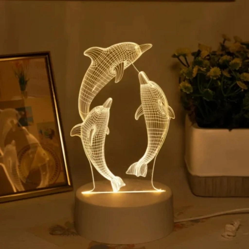 YUNUS TASARIMLI GECE LAMBASIÜrün ÖzellikleriYunus tasarımlı gece lambası, estetik ve modern çizgileriyle dekoratif aydınlatma arayanlar için ideal bir üründür. 3 boyutlu optik illüzyon etkisi yaratan özel akrilik paneli sayesinde gece boyunca huzurlu ve yumuşak bir ışık sunar. Özellikle çocuk odaları, yatak başları veya çalışma masaları için tercih edilen bu lamba, düşük enerji tüketimi ile uzun süreli kullanım sağlar. USB kablo bağlantısıyla çalışır ve ambiyansa uygun aydınlatma imkânı sunar. Zarif yunus figürleriyle tasarlanan bu lamba, hem gece lambası hem de dekoratif obje olarak kullanılabilir.Paket İçeriği1 Adet Yunus Tasarımlı Gece Lambası