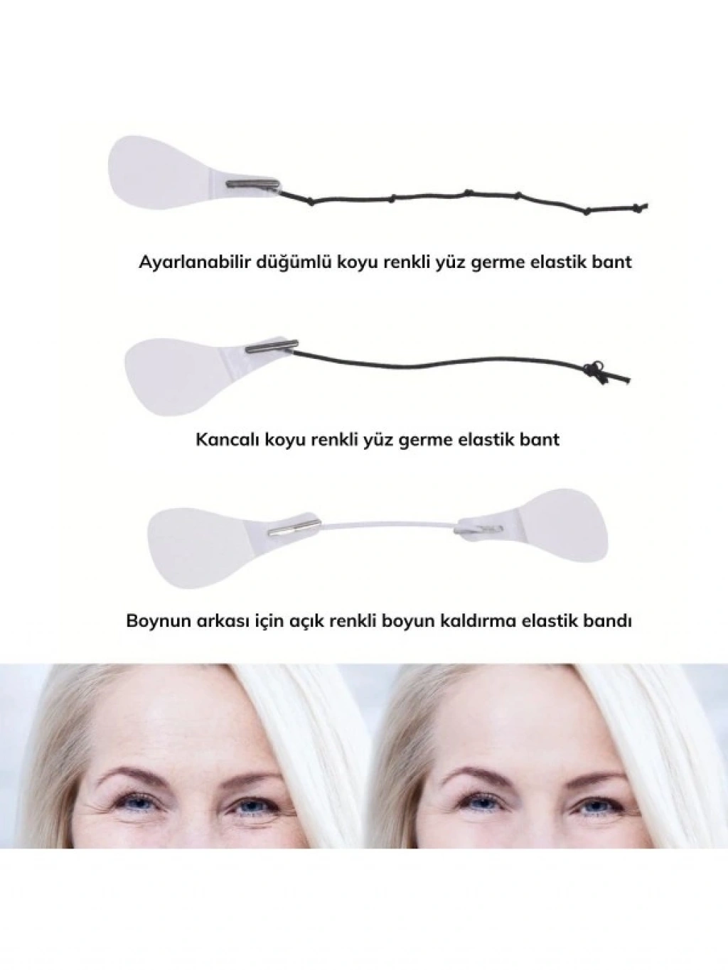 Lastikli Yüz Kaş Göz Boyun Gerdirme Bantları (40 Adet)Ürün Özellikleri:V Şekilli Bir Yüz için: Yüz germe pedleri, iyi esnekliğe sahip su geçirmezdir ve cildinizi rahatsız etmez. V şeklinde bir yüz oluşturmak için cildinizi kaldırabilir ve sıkılaştırabilir.Yumuşak ve Rahat: 40 adet hipoalerjenik yüz germe bantları vardır ve bunlar çevre dostu silikon kauçuk malzemelerden yapılmıştır, kullanımı güvenlidir, sağlıklı, yumuşak ve rahattır.Mükemmel Yüz Germe: Yüz ve boyun germe seti, gevşek cildi iyileştirir ve yüz, boyun, çene ve göz bölgesindeki kırışıklıkları ortadan kaldırır.Daha Genç Olun: Yüz germe bandı, sarkan yüz kaslarını germeye yardımcı ve yüzünüzü şekillendirmeye yardımcıdır. İlk kullanımla beraber daha genç görünecek ve harika hissedeceksiniz.Geniş Uygulamalar: Yüz germe bandı özel günler, düğünler, toplantılar, modellik, fotoğraf çekimi, seyahat vb. için idealdir. İnce, sıkı ve güzel bir yüzün şekillendirilmesine yardımcı olur.Malzeme: Silikon,kauçukRenk: şeffafPaket İçeriği:40 adet Yüz Germe Bandı ve Kademeli Uygulama Lastikleri